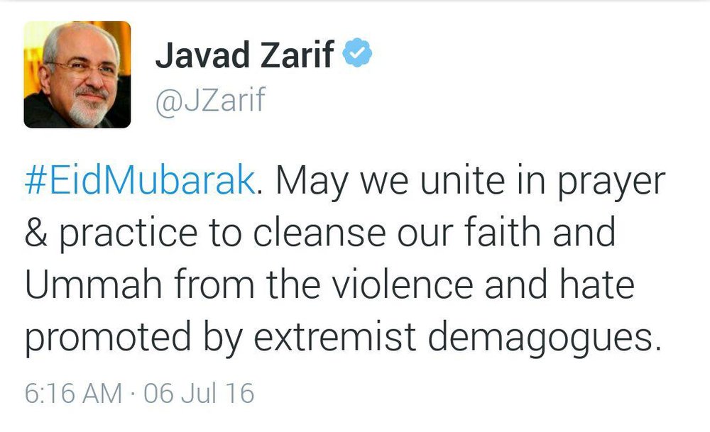 وزیرامورخارجه کشورمان طی پیامی در توییتر عید سعید فطر را تبریک گفت. به گزارش ایسنا، تبریک توئیتری ظریف به مناسبت عیدفطر به این شرح است: عیدمبارک. امید است همگى ما با دعا و دیندارى، ایمان و امت خود را از خشونت و تنفرى که توسط کوته اندیشان تندرو ترویج میشود، پاک کنیم.