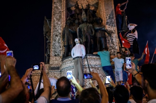 عصرایران - معترضان در میدان تقسیم استانبول، با برافراشتن دار اعدام، خواستار اعدام فتح الله گولن شدند. گولن از سوی دولت اردوغان به عنوان عامل کودتا معرفی شده. در روزهای اخیر بارها هواداران اردوغان با شعار دادن خواستار بازگشت اعدام شدند و اردوغان هم مخالفتی با آن نکرده اند. ترکیه از سال 2004 تاکنون اعدام را لغو کرده است/ خبرگزاری فرانسه - اوزان کوسی