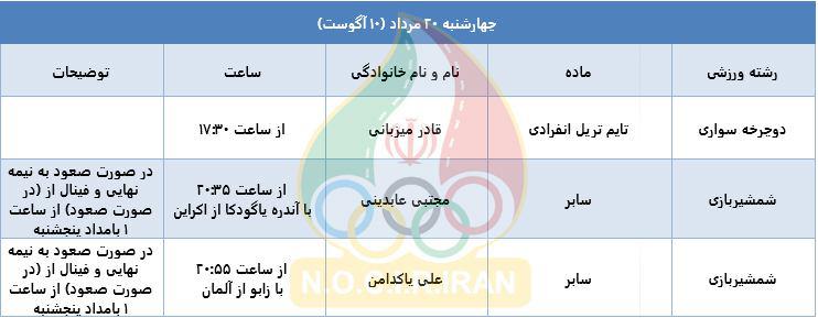 برنامه امروز ورزشکاران ایران در المپیک ریو (جدول)