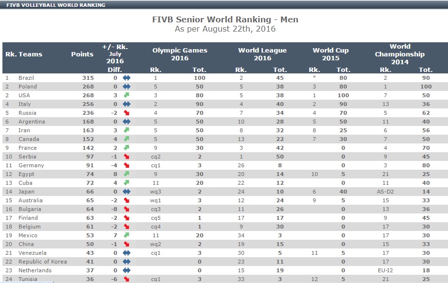 تیم ملی ایران همان طور که پیش بینی می شد به رتبه هفتم رنکینگ فدراسیون جهانی والیبال صعود کرد. شاگردان لوزانو با صعودبه مرحله یک هشتم نهایی مسابقات المپیک موفق شدند خودشان را تا رتبه هفتم بالا بکشند.