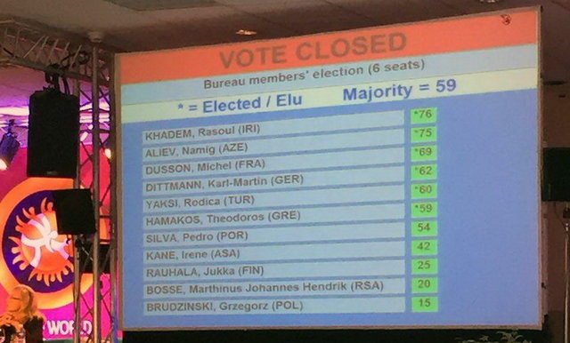 نتیجه این رای گیری که ظهر امروز به وقت محلی در حاشیه برگزاری مسابقات کشتی آزاد جوانان جهان در ماکون فرانسه برگزار شد به ترتیب زیر است: