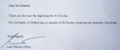 دانشگاه آکسفورد، بخش تایید مدارک، در پاسخ به استعلام "الف"، با ارسال فکسی اعلام کرد، هیچ سابقهای از فردی به اسم آقای علی کردان در این دانشگاه مبنی بر دریافت دکتری افتخاری وجود ندارد.