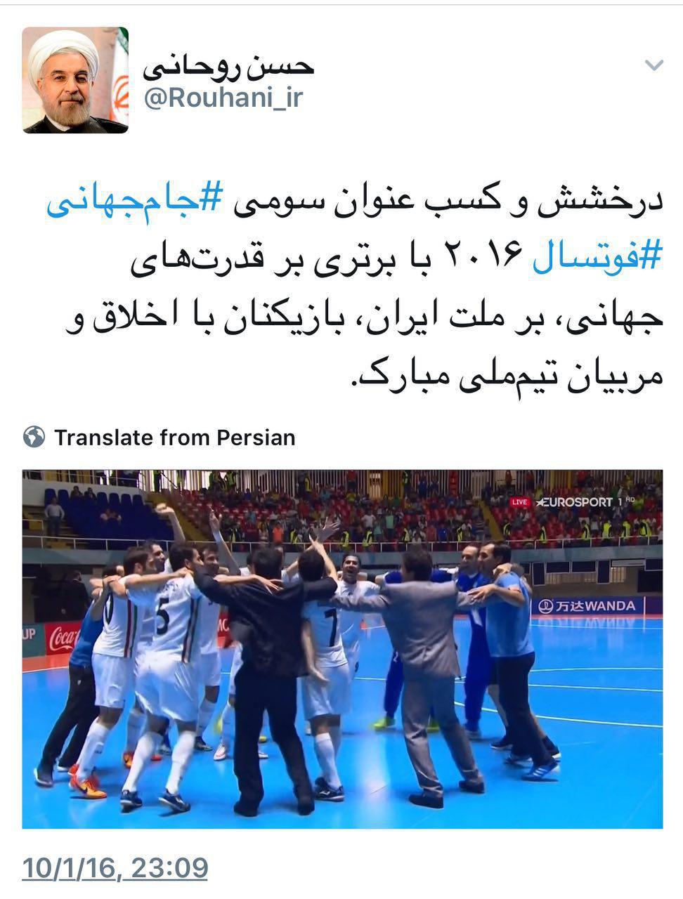 حسن روحانی در توئیتر سوم شدن تیم ملی فوتسال ایران را در جام جهانی تبریک گفت.