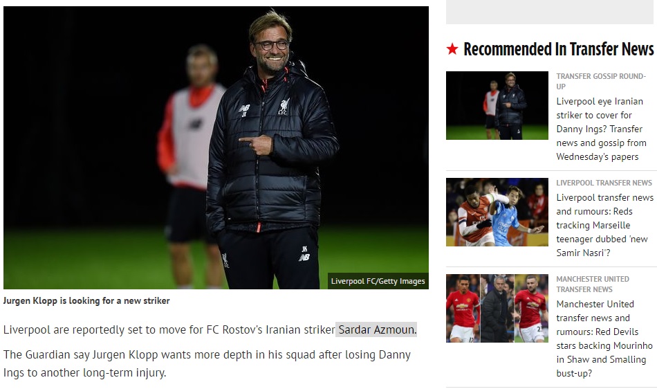«یورگن کلوب،سردار آزمون را برای نقل و انتقالات زمستانی تحت نظر گرفته» این شایعه ای است که طی چند ساعت گذشته در رسانه های معتبر انگلیسی منتشر شده است.