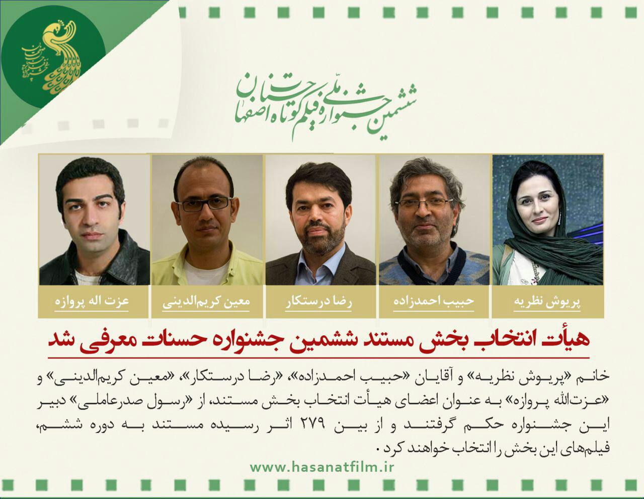 به گزارش ستاد خبری جشنواره حسنات، خانم «پریوش نظریه» و آقایان «حبیب احمدزاده»، «رضا درستکار»، «معین کریم‌الدینی» و «عزت‌الله پروازه» به عنوان اعضای هیأت انتخاب بخش مستند، از «رسول صدرعاملی» دبیر این جشنواره حکم گرفتند و از بین 279 اثر رسیده مستند دوره ششم، فیلم‌های این بخش را انتخاب خواهند کرد.