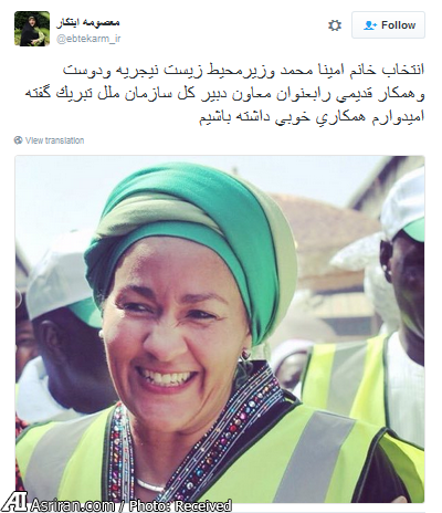 به گزارش عصر ایران، آنتونیو گوترش دبیرکل آتی سازمان ملل، خانم امینا محمد وزیر محیط زیست نیجریه را که یک انگلیسی نیجریه ای تبار است، به عنوان معاون خود انتخاب کرد. در همین راستا معصومه ایتکار نیز با انتشار پستی در توییتر شخصی خود سمت معاونی دبیر کل را به دوست و همکار قدیمی خود تبریک گفت.