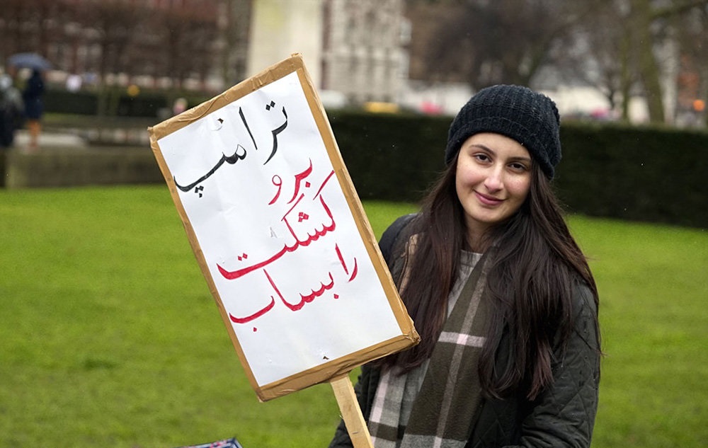 شعار دختر ایرانی علیه ترامپ در لندن (عکس)