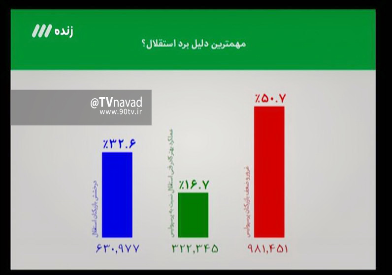 نظرسنجی دربی 84 برنامه نود مختص دلیل برد استقلال بود. سوال پیامکی این بود که جوان های استقلال خوب بودند؟ تاکتیک استقلال بهتر از پرسپولیس بود یا بازیکنان پرسپولیس ضعیف و مغرور بودند؟سوالی که در نهایت با شرکت بیش از دو میلیون و ۹۲ هزار نفر در نظرسنجی، ۵۰،۷ درصد بینندگان غرور و عملکرد ضعیف بازیکنان پرسپولیس را دلیل برد استقلال در دربی ۸۴ عنوان کردند، ۳۲،۶ درصد به عملکرد بازیکنان استقلال و ۱۶،۷ درصد به عملکرد بهتر کادر فنی استقلال نسبت به پرسپولیس رای دادند.