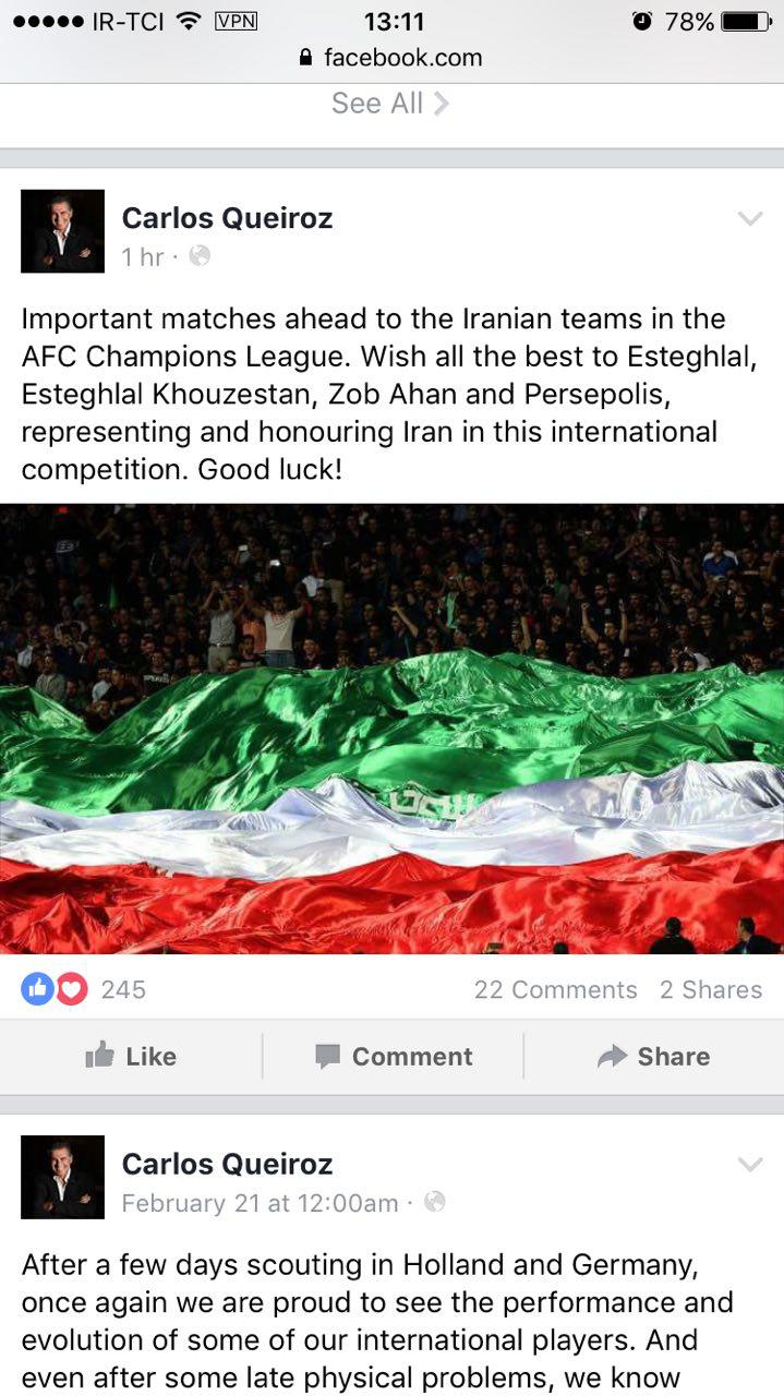 به گزارش عصرایران ، پس از اینکه سرمربی پرسپولیس در مصاحبه ای پیش از بازی تیم اش برابر الهلال برای تیم ملی و کادر فنی اش آرزوی موفقیت کرده و گفته بود که ازآنها حمایت می کند حالا کارلوس کی روش در یک پست فیس بوکی برای هر چهار تیم ایرانی آرزوی موفقیت کرده است.