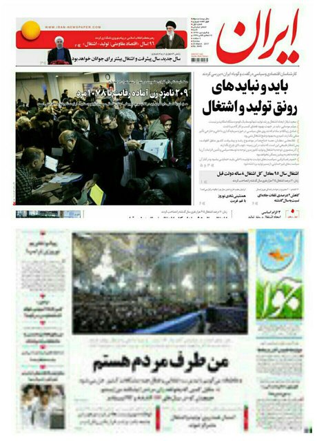 روزنامه «ایران» به سخنان مقام معظم رهبری در جوار حرم مطهر امام رضا(ع) و پیام نوروزی ایشان پرداخته  و درهمین راستا نیز به پیام نوروزی رییس جمهور که سال جدید را سال پیشرفت برای ملت عزیز و اشتغال برای جوانان دانسته، اشاره کرده است.