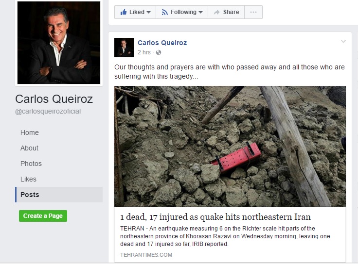 کارلوس کی روش سرمربی تیم ملی ایران با بازماندگان و آسیب دیدگان زلزله مشهد ابراز همدردی کرد. او با باز نشر خبر فوت شده و آسیب دیدگان زلزله نوشت.