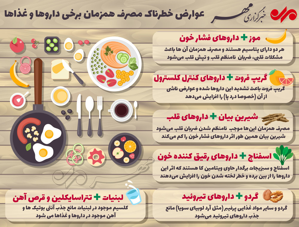 مصرف همزمان برخی از داروها و غذاها خطرناک است؛ برخی از مواد غذایی خواص داروها را از بین برده و برخی دیگر اثرات و عوارض داروها را تشدید می‌کنند.