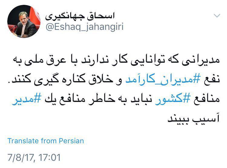 جهانگیری در توئیترش نوشت: مديرانی كه توانايی كار ندارند با عرق ملی به نفع مديران كارآمد و خلاق كناره گيری كنند. منافع كشور نبايد به خاطر منافع يك مدير آسيب ببيند.