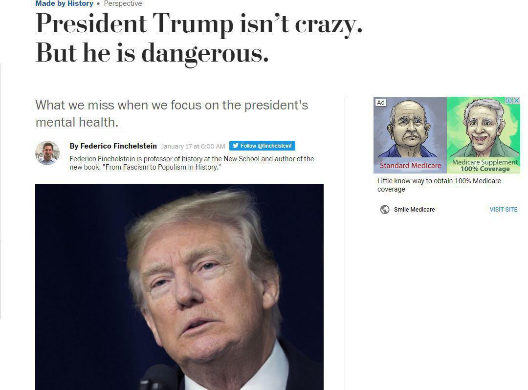 تیتر واشنگتن‌پست بعد از اظهارنظر پزشک کاخ سفید درباره سلامت روانی ترامپ: رئیس‌جمهور ترامپ دیوانه نیست اما خطرناک است