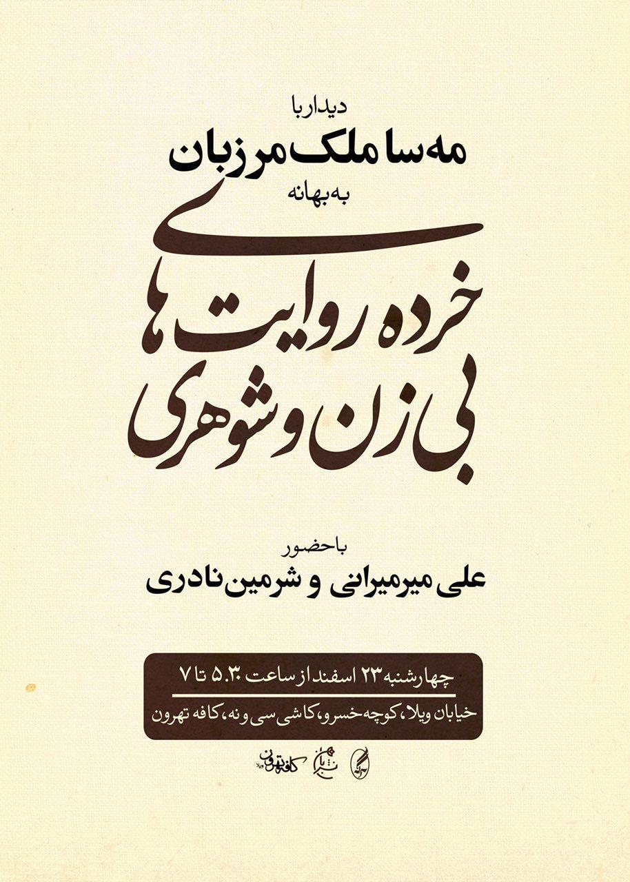 جلسه ی دیدار با مهسا ملک مرزبان به بهانه کتاب "خرده روایت های بی زن و شوهری" اولین اثر داستانی او با حضور علی میرمیرانی و شرمین نادری چهارشنبه 23 اسفندماه ساعت 17:30 تا 19 در خیابان نجات الهی- کوچه خسرو - کاشی سی و نه - مرکز تهران برگزار می شود.