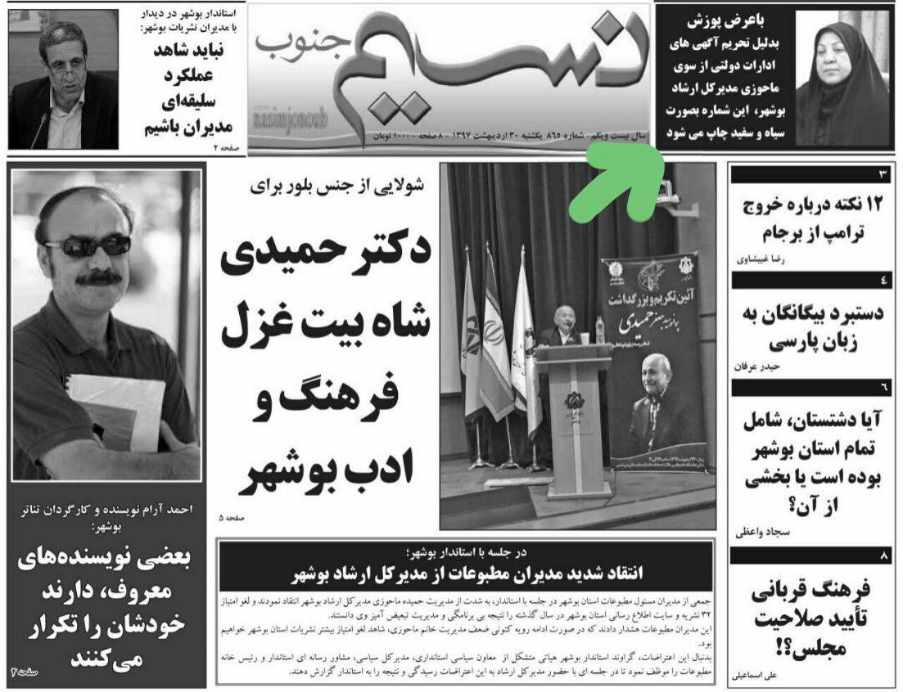 هفته نامه نسیم جنوب چاپ بوشهر در اعتراض به جلوگیری از ارایه آگهی ادارات به برخي از مطبوعات محلی و توزیع ناعادلانه آگهی ها توسط ارشاد استان، به صورت سیاه و سفید منتشر شد.