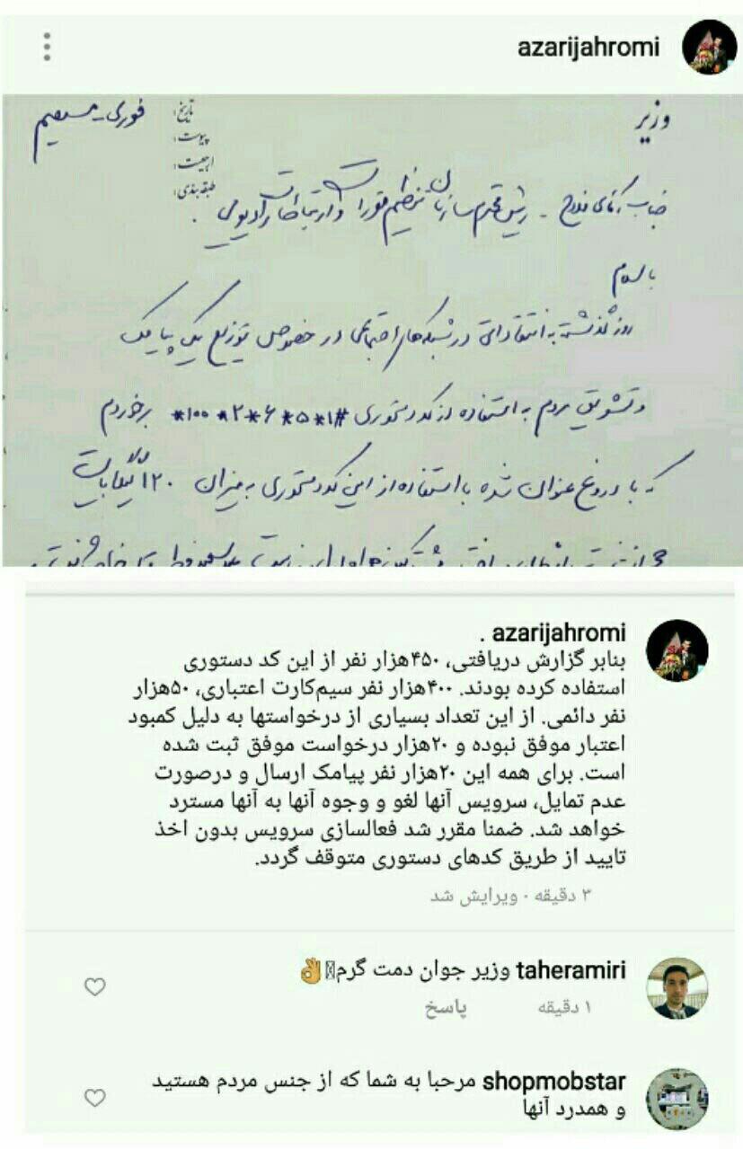 آذری جهرمی در صفحه شخصی اش نوشت: آذری جهرمی برای رسیدگی فوری به پیامک جعلی جنجالی دستوری صادر کردند که پس از گذشت هشت ساعت #نتیجه_به_نفع_مردم حاصل شد.