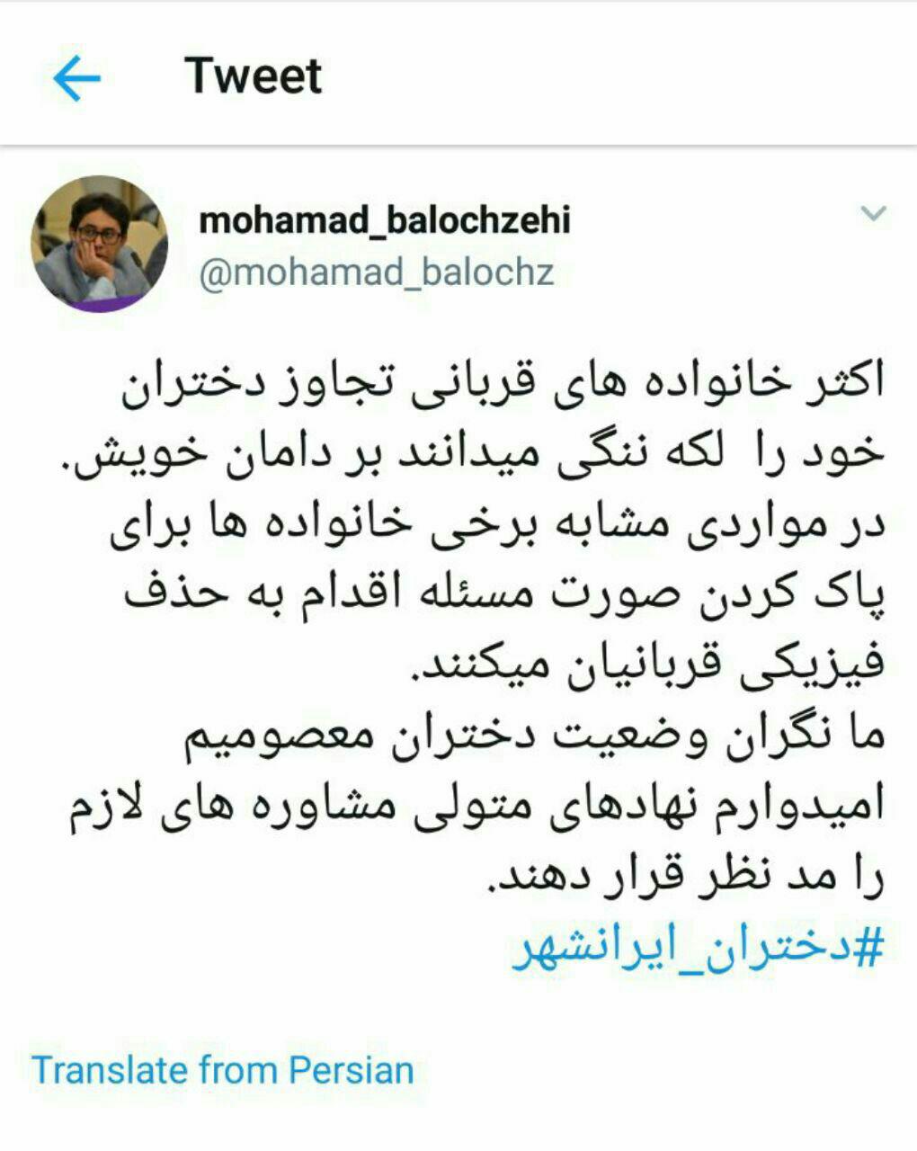 بخشدار نیک شهر در سیستان و بلوچستان در توئیتر نوشت: برخی خانوادهها اقدام به حذف فیزیکی قربانیان تعرض، مشابه حادثه دختران ایرانشهری میکنند. ما نگران وضعیت دختران معصومیم.