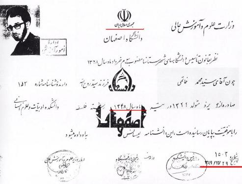 آنچنان که تصویر این مدرک که برخلاف مدرک ساختگی علی کردان کاملا" به زبان فارسی نوشته شده نشان میدهد؛ آقای سیدمحمد خاتمی فرزند سید روح الله دارای شناسنامه شماره 153 صادره از یزد متولد 1322 در تیرماه 1348 تحصیل در رشته فلسفه را در دانشکده ادبیات و علوم انسانی دانشگاه اصفهان با موفقیت به پایان برده و دانشنامه لیسانس دریافت کرده است.