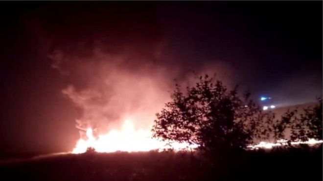 ویدئو از محل حادثه شعله های شدید سوختن هواپیما را پس از برخورد آن به حصار فرودگاه و سرازیر شدن به داخل رودخانه نشان میدهد.