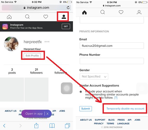 سپس در قسمت بالا سمت راست صفحه قابل مشاهده، برروی شکلک آدمکی رفته و برروی ویرایش پروفایل (Edit Profile) کلیک کنید.در اینجا و در قسمت پایین صفحه، گزینه غیرفعالسازی موقتی حساب کاربری (Temporarily disable my account) مشاهده میشود که درصورت اطمینان از این کار، باید برروی آن کلیک کرده و یا ضربه بزنید.