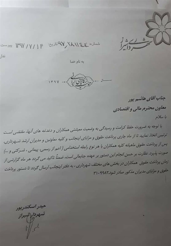 شهردار شیراز در نامهای به معاون مالی و اقتصادی خود دستور داد که ابتدا حقوق همه کارکنان این سازمان پرداخت شود و پس از آن اجازه پرداخت حقوق شهردار، معاونان و مدیران ارشد شهرداری شیراز را بدهد.