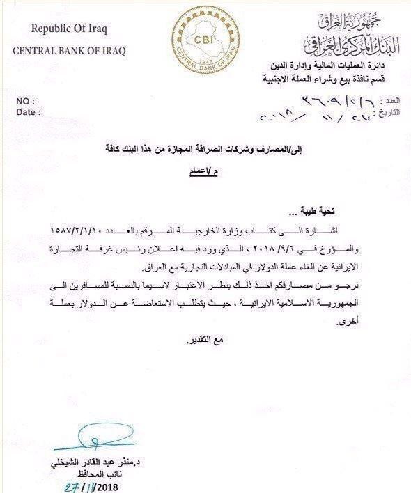 به گزارش خبرگزاری تسنیم ، بانک مرکزی عراق در بخشنامهای که برای تمامی بانکهای عراقی ارسال شده تاکید کرد، با توجه به یادداشت وزارت خارجه عراق و نیز گفتههای رئیس اتاق بازرگانی ایران در رابطه با توقف تعامل با دلار در مبادلات تجاری با عراق، تمامی بانکهای عامل موظفند از فروش دلار به مسافرانی که قصد عزیمت به جمهوری اسلامی ایران دارند امتناع کرده و در صورت درخواست ارزهای دیگری را به آنها بفروشند.