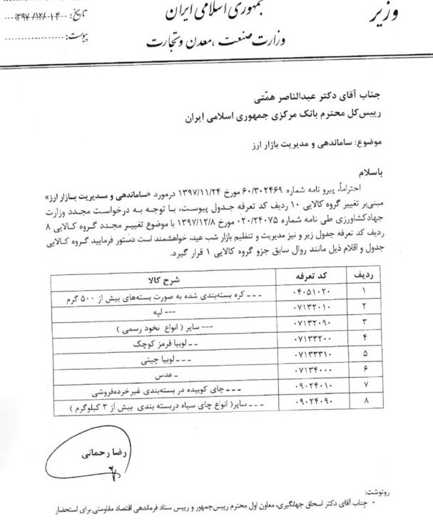 در نامه وزیر صنعت، معدن و تجارت آمده است: با توجه به درخواست مجدد وزیر جهاد کشاورزی، با موضوع تغییر گروه کالایی ۸ ردیف تعرفه برای مدیریت و تنظیم بازار شب عید خواهشمند است، دستور فرمایید گروه کالایی اقلام زیر مانند گذشته در گروه یک کالایی قرار گیرند.