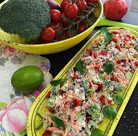 کلم بروکلی را خرد کنید و در آب بگذارید بماند کمی نمک روی آن بریزید تا همه چیز از آن بیرون بریزد و خوب بشویید. هویج ها را بعد از شستن با رنده درشت رنده کنید، پیاز قرمز را هم نگینی ریز خرد کنید و بقیه مواد را اضافه کنید و با هم مخلوط کنید.