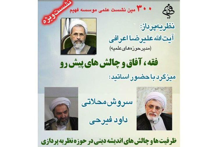 حجت‌الاسلام کاظم قاضی‌زاده، مدیر موسسه فهیم درباره این جلسه به ایرناپلاس گفت: موسسه فهیم از مهمترین موسسات نظریه‌پردازی قم است و تا کنون 300 نشست علمی با حضور افراد با گرایش‌های مختلف در این موسسه برگزار شده است. من به بهانه سیصدمین نشست با آیت‌الله اعرافی مدیر محترم حوزه علمیه تماس گرفتم و از ایشان دعوت کردم تا در این نشست حاضر شوند و موضوعی را ارائه کنند تا با حضور ایشان معلوم شود بر خلاف حرف‌هایی که این روزها زیاد می‌شنویم که در حوزه خبری نیست و نظریه‌پردازی وجود ندارد، کارهای زیاد و قابل توجه علمی و نظری در حوزه قم انجام شده است.