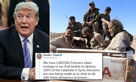 به گزارش ایسنا، به نوشته روزنامه دیلی میل، دونالد ترامپ، رئیس‌جمهوری آمریکا در پیام توییتری نوشت: ۱۸۰۰ زندانی داعشی داریم که در نبردهای پایانی ما برای تخریب ۱۰۰ درصدی این خلافت در سوریه گرفتیم. اکنون باید تصمیم‌گیری شود که با این زندانیان خطرناک چه شود.