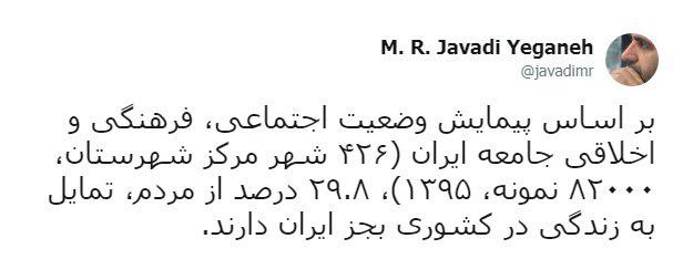 جوادی یگانه معاون فرهنگی شهرداری تهران و استادجامعه شناسی دانشگاه تهران در توئیتر نوشت: بر اساس پیمایش وضعیت اجتماعی، فرهنگی و اخلاقی جامعه ایران (۴۲۶ شهر مرکز شهرستان، ۸۲۰۰۰ نمونه، ۱۳۹۵)، ۲۹.۸ درصد از مردم، تمایل به زندگی در «کشوری بجز ایران» دارند.