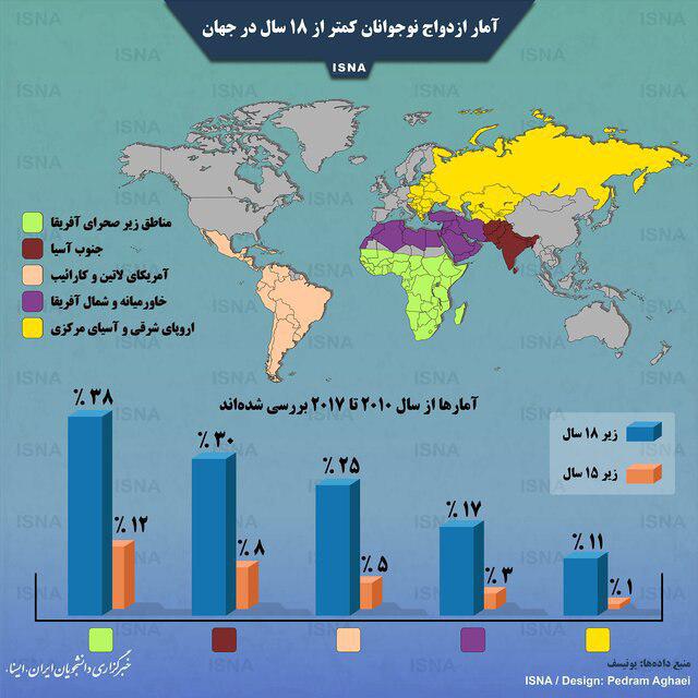 آمار ازدواج نوجوانان کمتر از ۱۸ سال در جهان (اینفوگرافی)