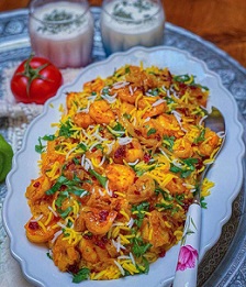داخل یک تابه دیگر مقداری روغن بریزید و میگوهای مزه دار شده را بریزید و خوب تفت بدهید و دوباره به آن زعفران اضافه کنید و وقتی خوب سرخ شدند با پیازهای سرخ شده مخلوط کنید. و به آن زرشک اضافه کنید و وقتی یک تفت خیلی کم که خورد زیر آن را خاموش کنید. سپس برنج آبکش شده را دم کنید و بعد از دم کشیدن داخل دیس بریزید و و روی آن را از مواد حاضر شده و برنج زعفرانی و جعفری خرد شده بریزید و سرو کنید.