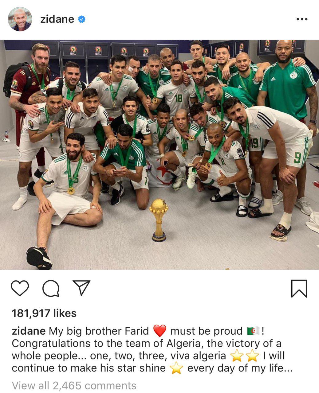 سرمربی رئال مادرید اسپانیا که اصالتی الجزایری دارد قهرمانی این کشور در جام ملت های آفریقا را تبریک گفت و او معتقد است با این عنوان برادرش که فوت شده به آنها افتخار می کند.