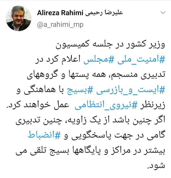 به گزارش عصرایران، علیرضا رحیمی در صفحه شخصی خود در توییتر نوشت: وزیر کشور در جلسه کمیسیون امنیت ملی مجلس اعلام کرد در تدبیری منسجم، همه پستها و گروههای ایست و بازرسی بسیج با هماهنگی و زیرنظر نیروی انتظامی عمل خواهند کرد.