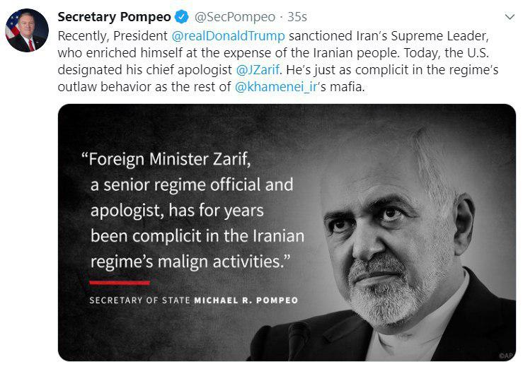 به گزارش صداوسیما، وزیر خارجه آمریکا با انتشار توئیتی ظریف را توجیه کننده سیاست های ایران عنوان کرد.