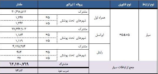 این آمار نشان میدهد تعداد مشترکان همراه اول، ۳۰ میلیون و ۳۹۸ هزار و ۵۱۲ نفر است و تعداد شهرهای تحت پوشش نسل سوم ۱۲۴۷ و شهرهای تحت پوشش نسل چهارم، ۱۲۴۶ شهر است. تعداد مشترکان ایرانسل، ۲۷ میلیون و ۶۴۶ هزار و ۹۰۳ نفر است و تعداد شهرهای تحت پوشش نسل سوم ۱۱۸۴ و شهرهای تحت پوشش نسل چهارم، ۱۱۱۹ شهر است.