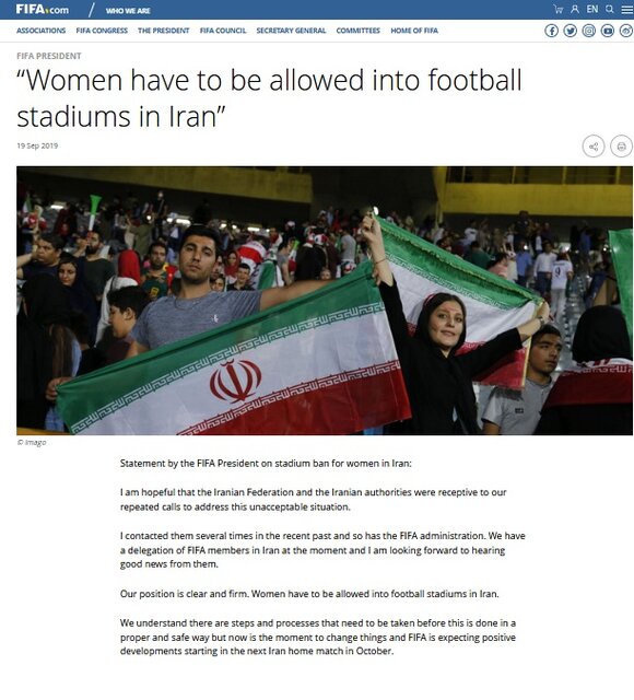 رییس فیفا در بیانیهای اعلام کرد که زنان ایرانی باید اجازه حضور در ورزشگاه را داشته باشند.