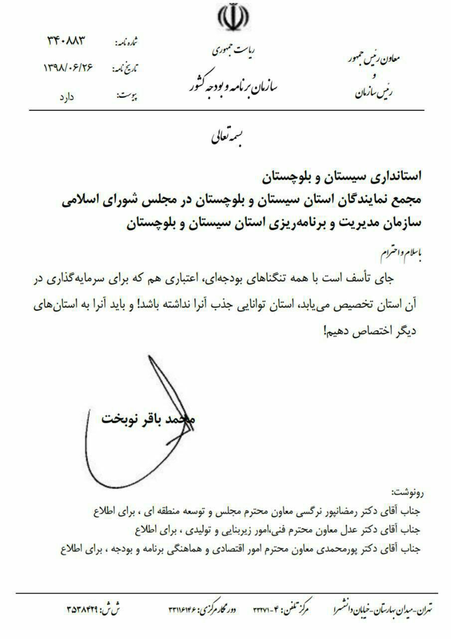 رییس هیات عامل سازمان گسترش و نوسازی صنایع ایران (ایدرو) گفت: پرداختن به موضوع نامه نوبخت به استانداری سیستان و بلوچستان ارزش وقت تلف کردن را ندارد.