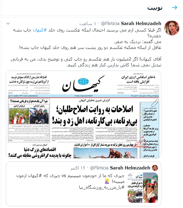 به گزارش عصر ایران، در پی انتشار عکس دو دختر تماشاگر ورزشگاه آزادی در صفحه اول روزنامه کیهان در روز شنبه و تکرار آن در روز یکشنبه با تیتر "قربانیان آزادی"، سارا حلم زاده یکی از آن دو دختربا انتشار متنی خطاب به کیهان در توئیتر خود نوشت: «آقای کیهان! اگر دو میلیون بار هم عکسم رو چاپ کنی و توضیح بدی، من به قربانی تبدیل نمی شم! کاش بذارین کنار هم زندگی کنیم.»