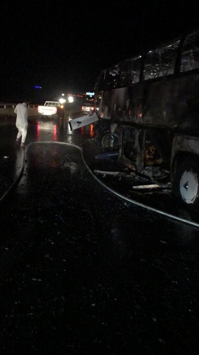 به نوشته این روزنامه سعودی، اتوبوس حامل این عمره‌گذاران که از اتباع خارجی هستند، در کیلومتر ۱۷۰ جاده «هجرت» با یک خودرو تصادف کرده و بر اثر آن اتوبوس مذکور دچار حریق شده‌ است.