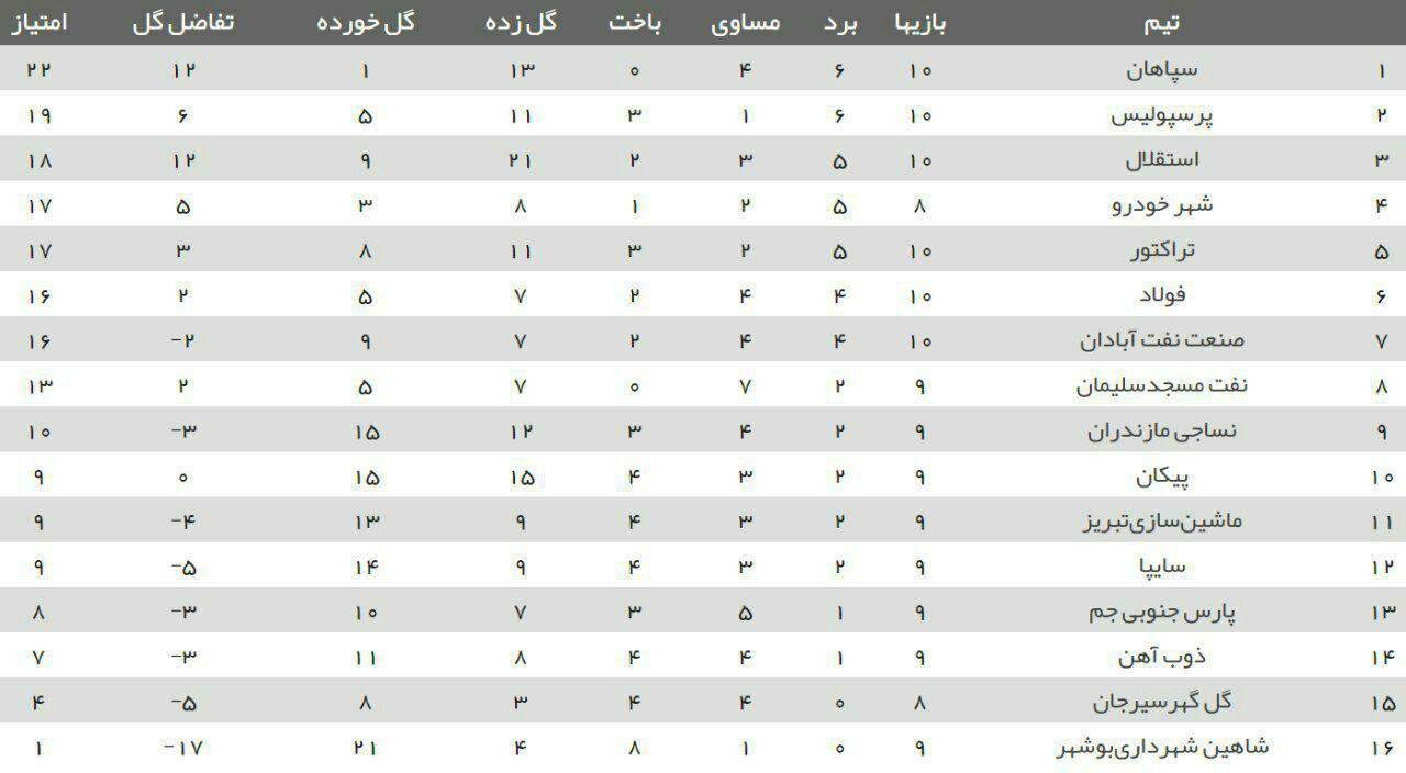 جدول لیگ برتر فوتبال پس از بازیهای امروز