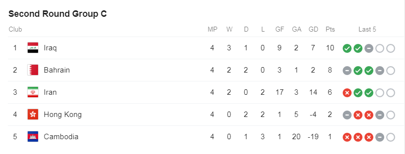 در دیگر دیدار این گروه امروز تیم بحرین با نتیجه تساوی بدون گل مقابل هنگ کنگ متوقف شده بود.