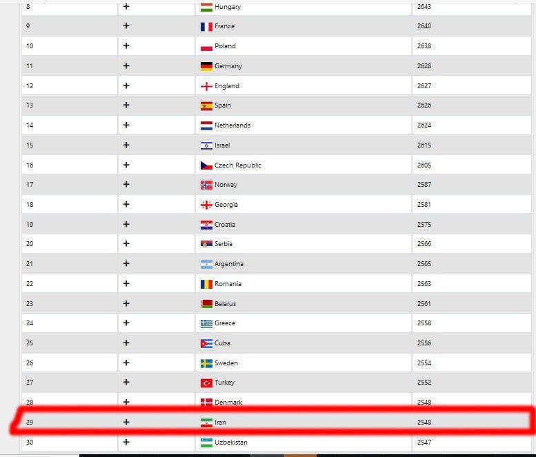 این در حالی است که شطرنج ایران در بخش تیمی این رده بندی متحمل سقوط سنگینی شده طوریکه از رده ۲۰ به ۲۹ تنزل پیدا کرده است.