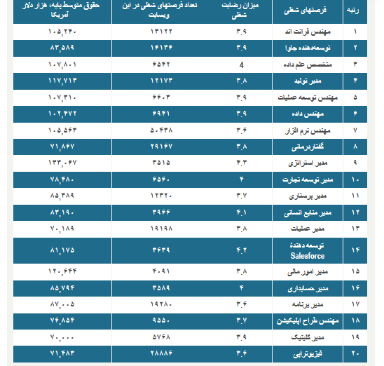 لازم به ذکر است که در همۀ این مشاغل دستمزدی بالاتر از ۸۰ هزار دلار پرداخت می‌شود و میزان رضایت کارکنان نیز ۳.۹ یا بالاتر (در مقیاس ۱ تا ۵) بوده است.