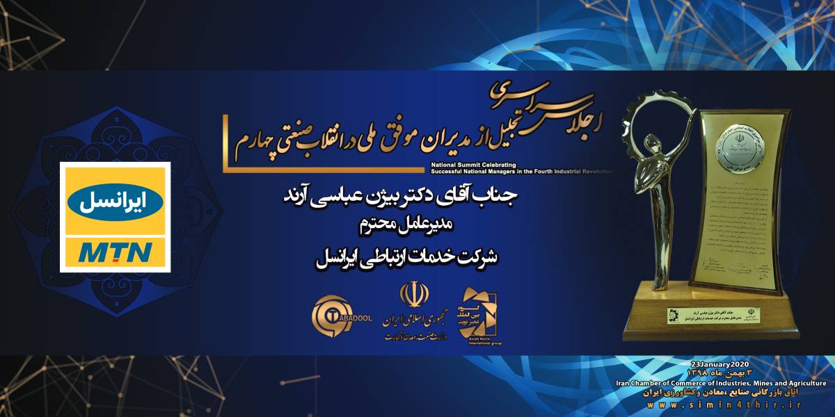 جایزه «مدیریت موفق ملی انقلاب صنعتی چهارم در هزاره سوم» صنعت ارتباطات و فناوری اطلاعات کشور، به مدیرعامل ایرانسل رسید.