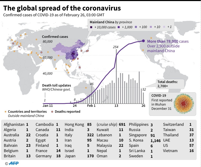 26 فوریه 2020- میزان انتشار ویروس کرونا در جهان- اینفوگرافی: خبرگزاری فرانسه