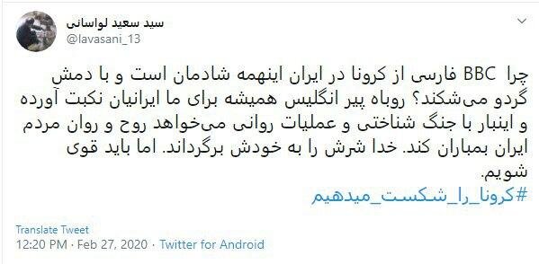 حجت الاسلام لواسانی، با انتشار توییتی کشور انگلیس که از این رسانهها حمایت میکند را روباه پیر خوانده و او را همواره در تلاش برای ایجاد موانع در مسیر پیشرفت ایران دانست. او در این توئیت نوشته است: چرا BBC فارسی از کرونا در ایران اینهمه شادمان است و با دمش گردو میشکند؟ روباه پیر انگلیس همیشه برای ما ایرانیان نکبت آورده و اینبار با جنگ شناختی و عملیات روانی میخواهد روح و روان مردم ایران بمباران کند. خدا شرش را به خودش برگرداند. اما باید قوی شویم.
