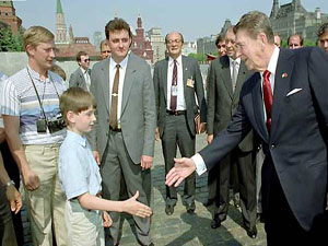 به گزارش جهان ،در این عکس که مربوط است به سال 1988 ریگان در جریان بازدید خود از مسکو در حال دست دادن با یک پسر جوان در میدان سرخ مسکوست.این عکس توسط پیت سوزا برداشته شده که امروز هم عکاس ارشد کاخ سفید است.